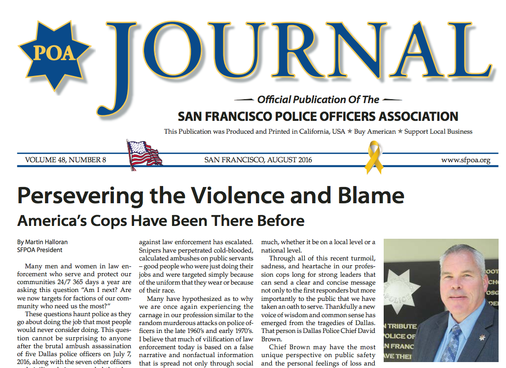 In the latest issue of the San Francisco Police Officers Association journal, union president Martin Halloran implores whomever is